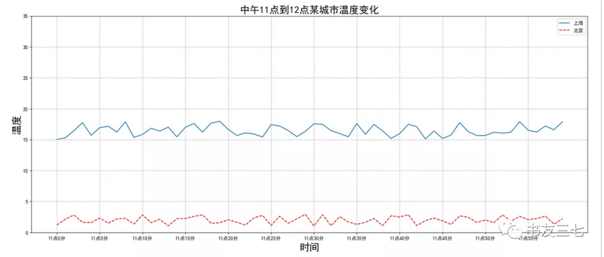 plt.xlabel("时间", fontsize=20) plt.ylabel("温度", fontsize=20) plt.title("中午11点到12点某城市温度变化", fontsize=20)